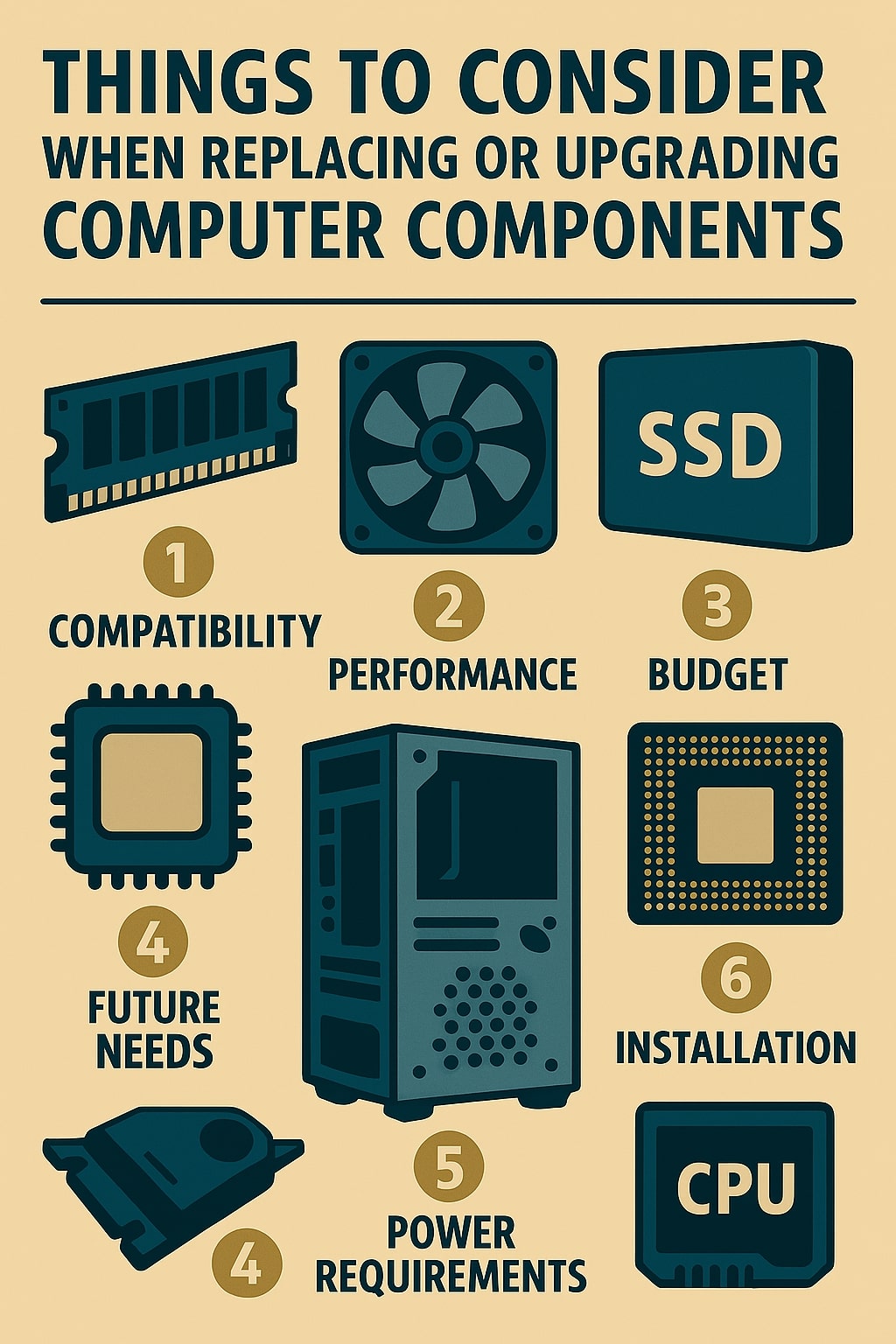 - Keep Cooling in Mind Newer or more powerful components often generate more heat. Consider whether your existing fans or heatsinks are sufficient, especially if you’re swapping in a more powerful CPU or GPU. Thermal paste and airflow planning go a long way.